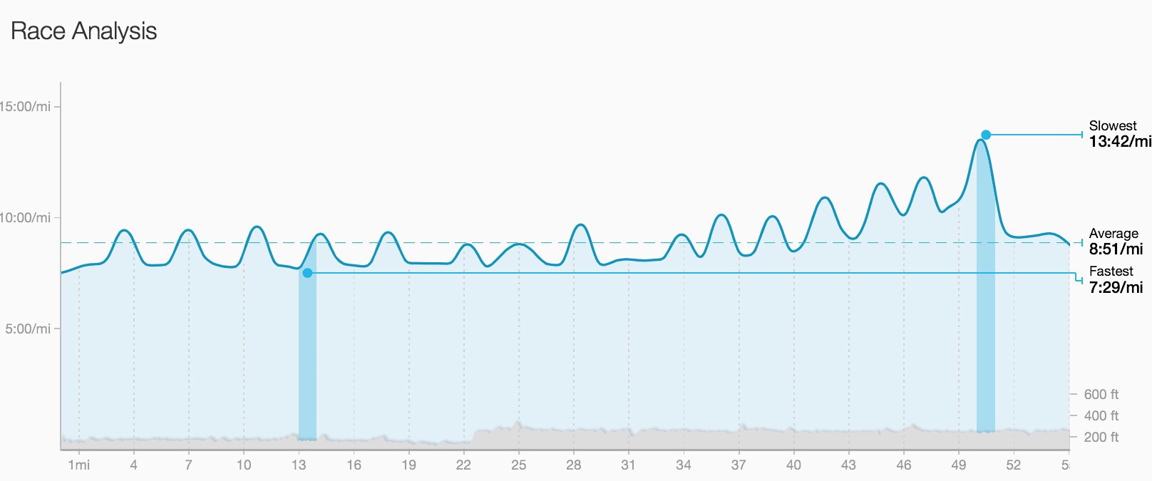The next four miles were where I lost any hope of sub 8 hours. I bumbled along to 50 miles, swearing and thinking about how stupid this was, two things gave me heart: