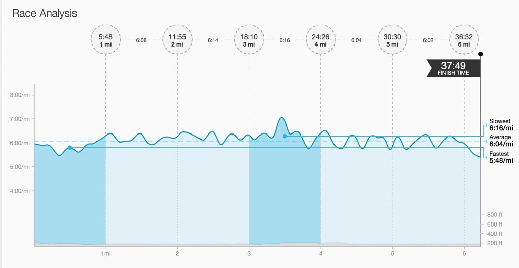 To do under 38 mins you need to average dead on 6:05 mins per mile; that was my target pace. If I could keep the watch at that I would be happy.