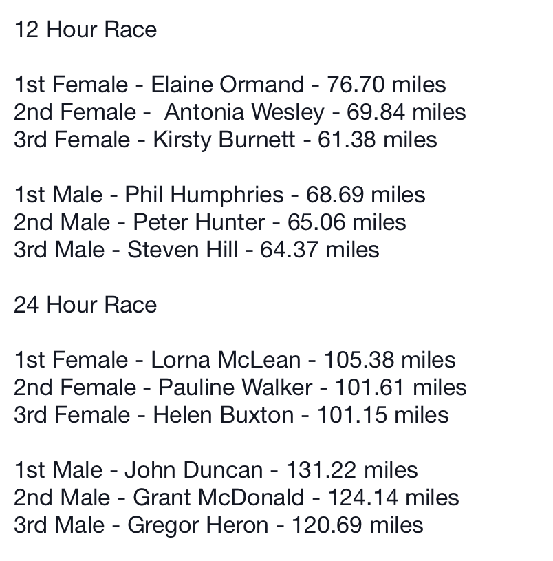 As was Gregor Heron and Grant McDonald’s drive to the other podium places. They looked in agony and fatigued but never gave up. There were a multitude of other heroes out there. Marianne Grover, at 68, was one of my favourites. She shuffled her way to a brilliant total but moreover, moved for 24 hours solid.