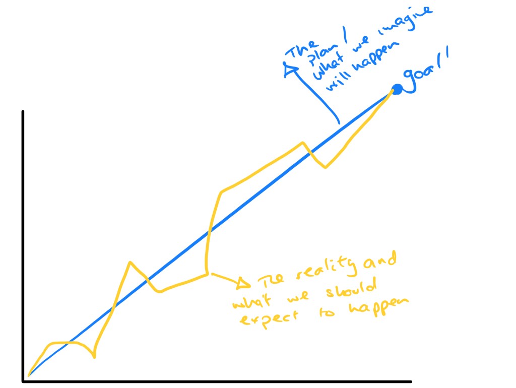 When we start the process of identifying the goal we naturally start to knit the journey together in a straight line. And the problem with this is that it tends to oversimplify the reality. Which in turn can, in my experience, cause people to lose perspective when things go both really well, and really wrong.