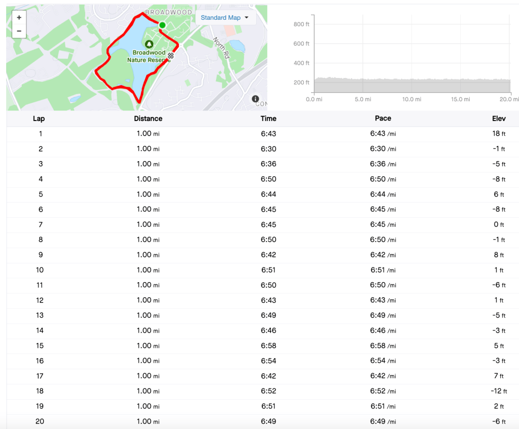 The set-piece long run session of the week was to run 40k at 7:00 /mi pace. This is what I would describe as closer to 100k pace for me. I decided to do this on loops at Broadwood loch. I haven’t run a decent paced long run since March and the 50k in Perth. So I knew this would be a challenge.
