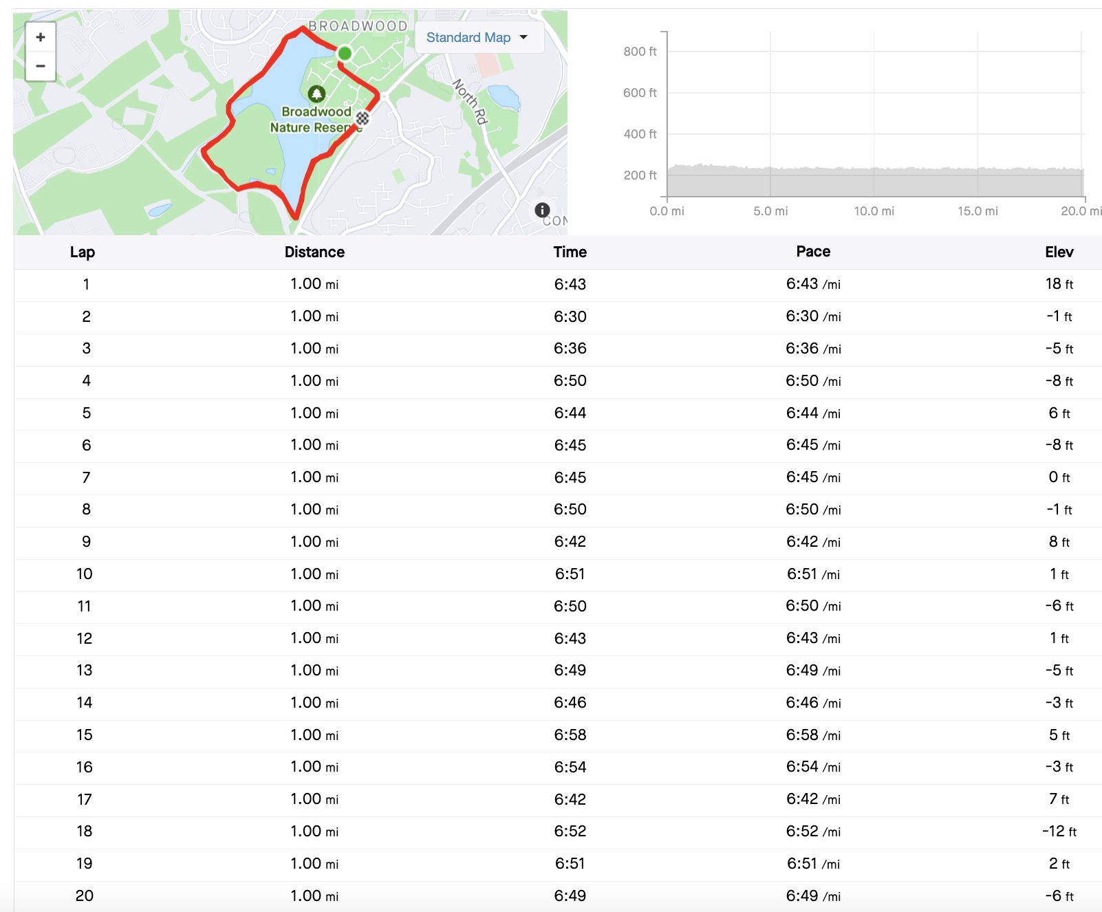 From about 13 miles I was finding my right side tight. At this stage in the rebuild there is no need to overdo it. After a strong interval session early in week and then a solid 20 miles I decided that being sensible was a good thing. And as you can see from the splits below, my pacing was solid.